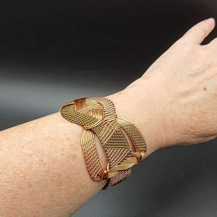 Браслет изготовлен в технике проволочного плетения. Оригинальная авторская работа. Браслет из цветной медной проволоки с защитным эмалевым покрытием, устойчивым к потускнению. Размер браслета в окружности 18 см. Ширина обода 17 мм. Размер широкой части 4,3 см. Браслет имеет магнитную застежку. Доставка – почтовая пересылка. Самовывоз из Ашдода.